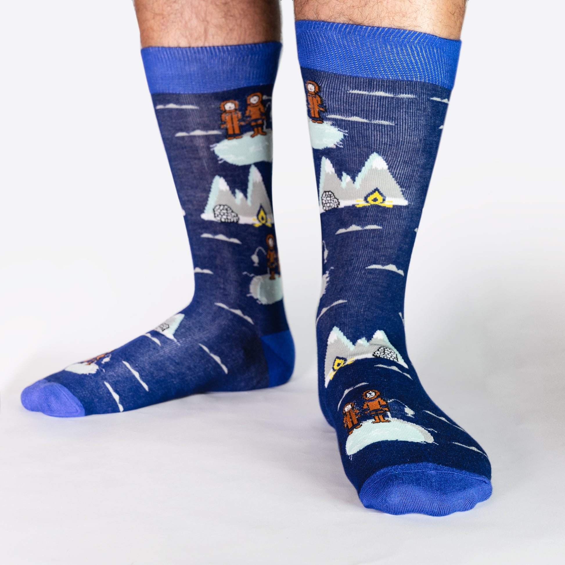 Get ready to dive into the icy wonders of our Gone Fishing Arctic Adventure socks! These socks are more than just a cozy accessory; they're an homage to the vibrant and resilient Inuit community and the breathtaking beauty of life on the ice.