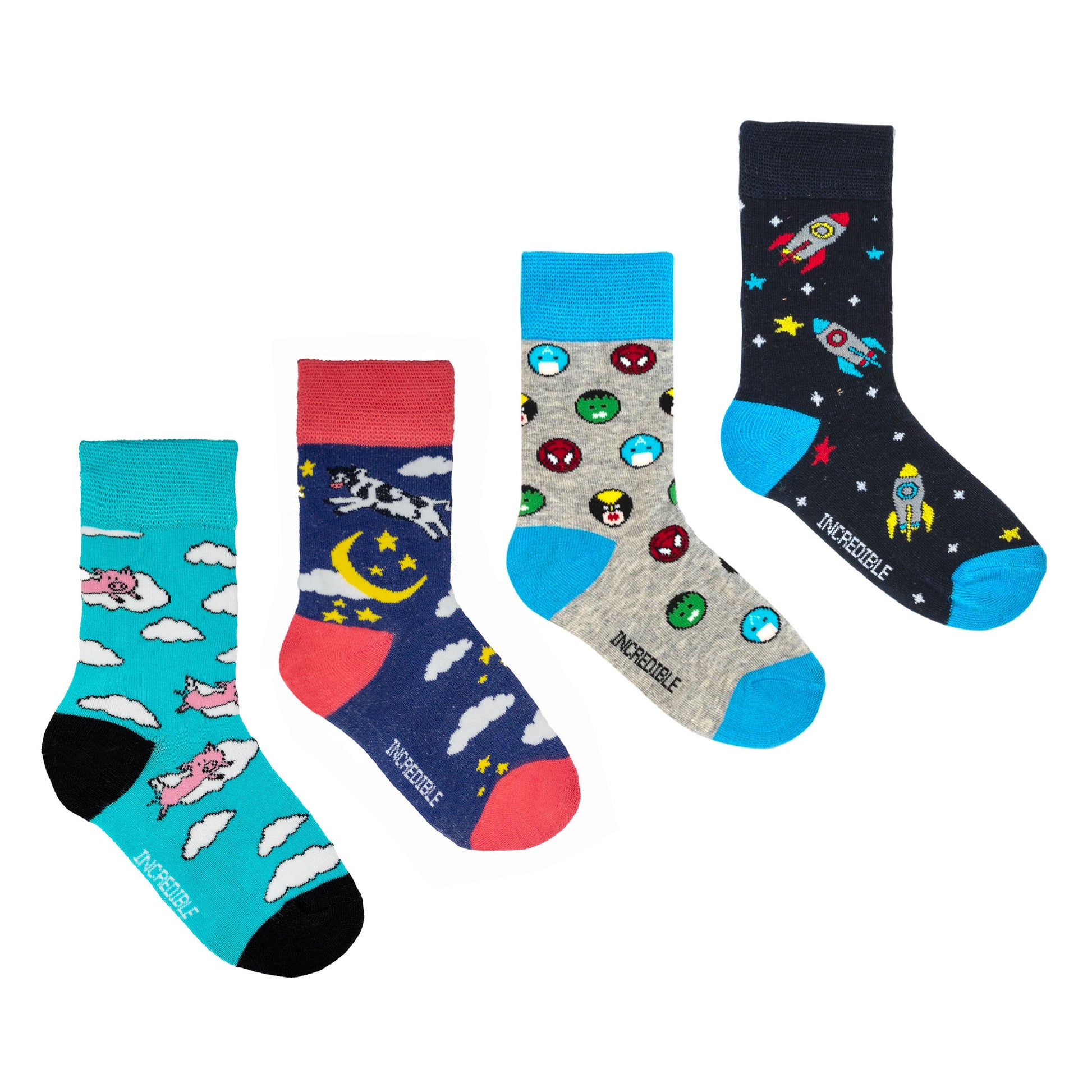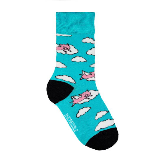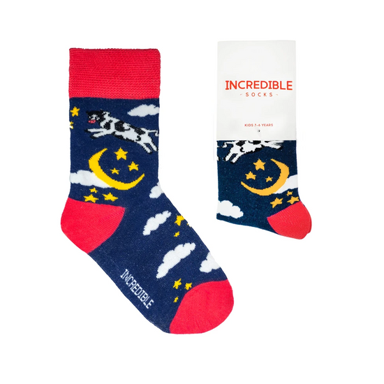 Unleash the magic and wonder of childhood with our incredible sock gift bundle for little adventurers! Packed with four enchanting styles – Pigs Will Fly, Another World, Hey Diddle, and Super Heroes – these socks are perfect for little dudes who love to play, explore, and dream big! All in a fun interactive gift box made especially for fun lovin' kids.